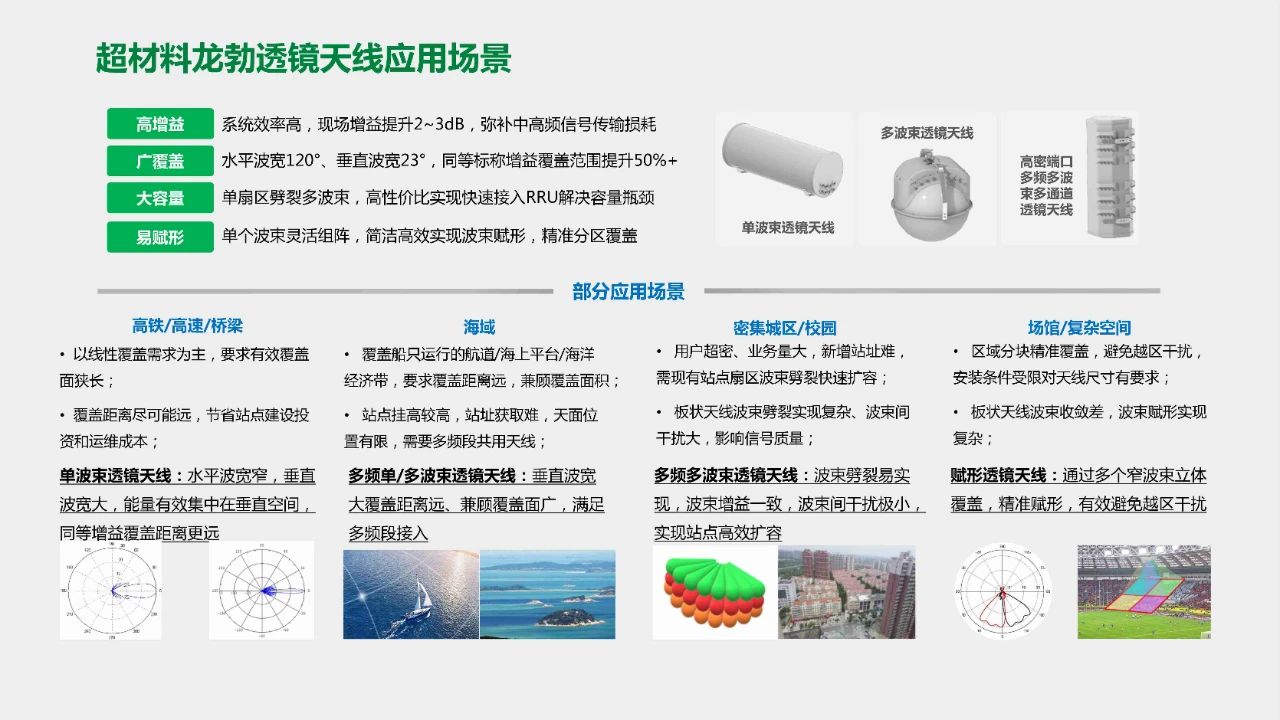 粤海信专攻通信天线研发生产领域多年,从2015年开始,粤海信就成立专攻团队和博士后创新实践基地,专注研发龙勃透镜,到如今该款天线已经实现规模化生产。该产品具有平面波,多焦点,宽频率,高效率,低反射,低副瓣等优点。能有效提升覆盖距离,可广泛运用于5G通信等领域,涉及高铁、高速、校园、小区、海域、隧道等多种应用场景。